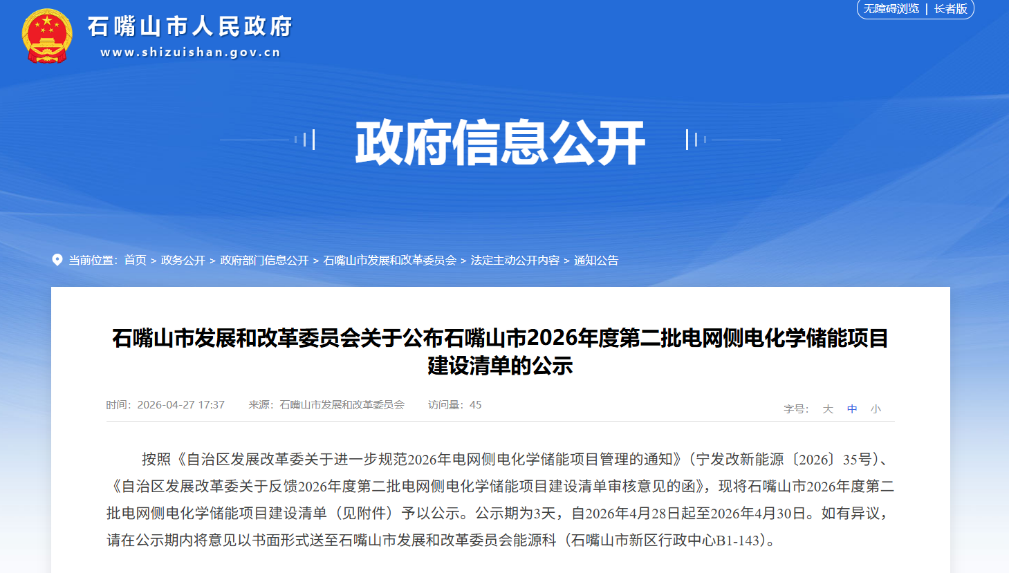 北极星储能网获悉,4月27日,宁夏石嘴山市发展和改革委员会公布石嘴山市2026年度第二批电网侧电化学储能项目建设清单,公示期为3天,自2026年4月28日起至2026年4月30日。