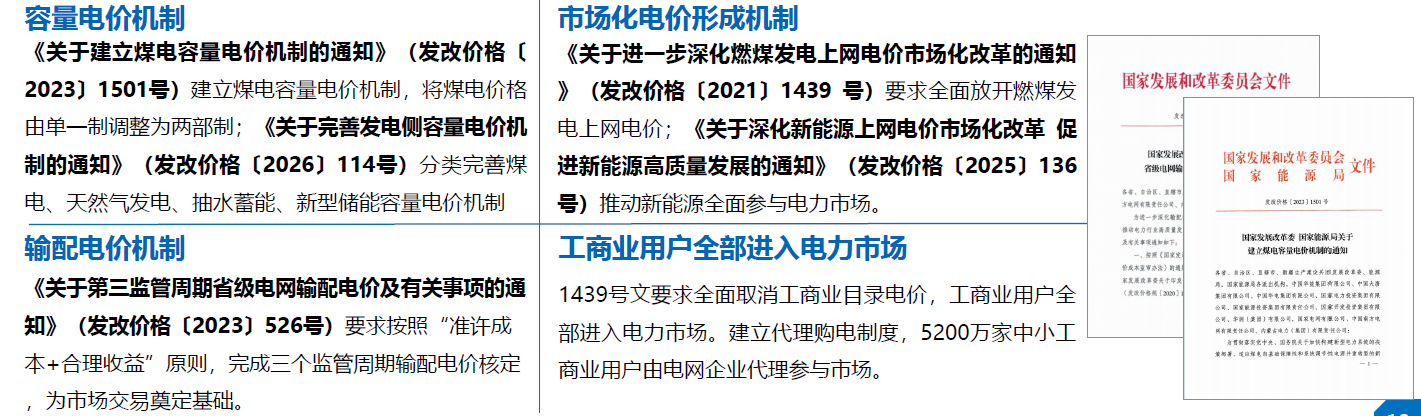 建立健全容量电价机制,分类完善煤电、天然气发电、抽水蓄能、新型储能容量电价机制。明确核定输配电价机制;全面放开燃煤发电上网电价;推动新能源全面参与电力市场;建立代理购电制度,中小工商业用户由电网企业代理参与市场。