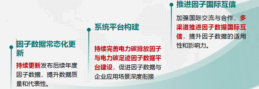 基于数据代表性、科学性、可追溯性等核心原则,进一步扩大电力碳排放因子与电力碳足迹因子测算覆盖范围,丰富案例样本,加强因子数据迭代,提高因子的科学性、准确性、代表性。同时积极探索拓展因子品种与应用维度,深化典型场景应用实践,全面提升因子应用支撑能力。