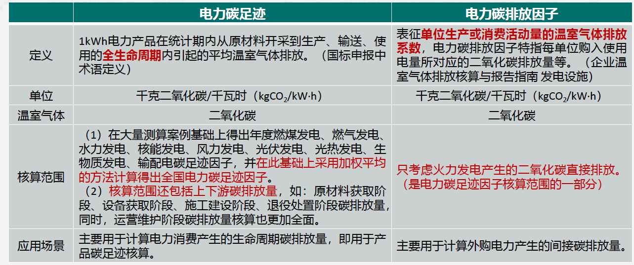 “电力碳足迹因子”与“电力碳排放因子”存在一定联系,前者从全生命周期视角量化电力碳排放强度,后者重点关注电力系统运行阶段的直接碳排放强度。电力碳足迹核算方法是一套独立的规则体系,核心要素是需要计入能源上游排放和电力设施/系统的碳足迹,具备可追溯特点。