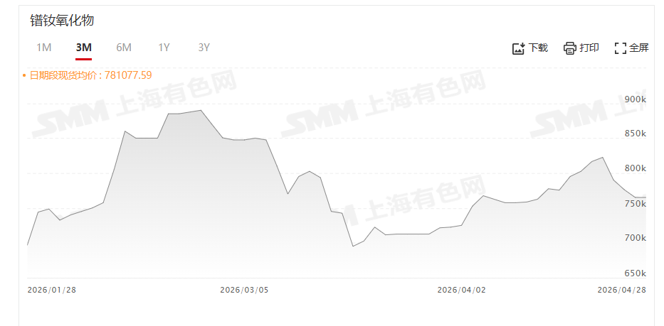 据SMM报价显示,4月28日,氧化镨钕价格为760000~770000元/吨,其均价为765000元/吨,较前一交易日持平。