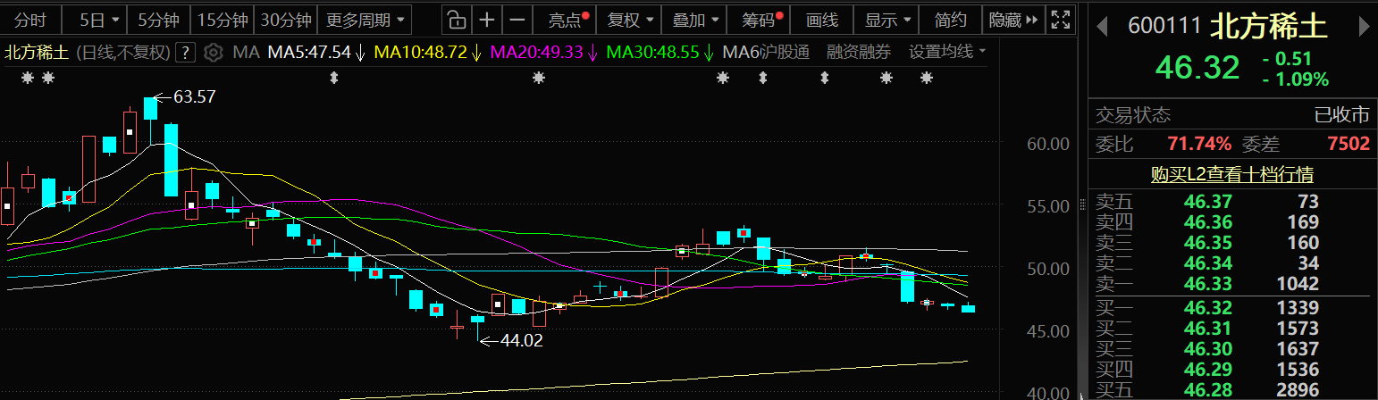 4月28日,北方稀土的股价出现下跌,截至28日收盘,北方稀土跌1.09%,报46.32元/股。