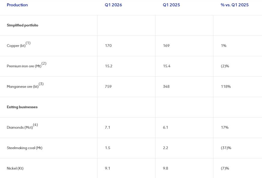 英美资源集团4月28日公布,一季度铜产量同比增长1%至170,400吨,主要得益于Los Bronces和Collahuasi矿因处理量提升而实现增产,但部分被Quellaveco矿品位下降所抵消。