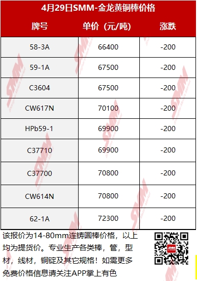 【SMM价格】2026年4月29日金龙黄铜棒价格