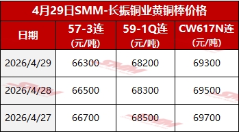 【SMM价格】2026年4月29日长振黄铜棒价格