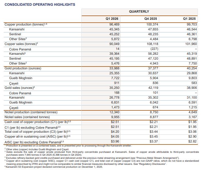 2026年第一季度,铜总产量达96,469吨,较2025年第四季度下降4%,减产主要源于森蒂纳尔(Sentinel)与坎桑希(Kansanshi)矿区,符合矿山开采规划的矿石品位下行趋势。当期铜C1现金成本为每磅2.51美元,环比上升0.30美元,主要受铜产出量减少、赞比亚克瓦查汇率走强推高人力成本影响。铜总销量90,049吨,较产量减少约6,420吨,原因在于销售节奏调整,且坎桑希矿区在上一季度高销量后补充库存。
