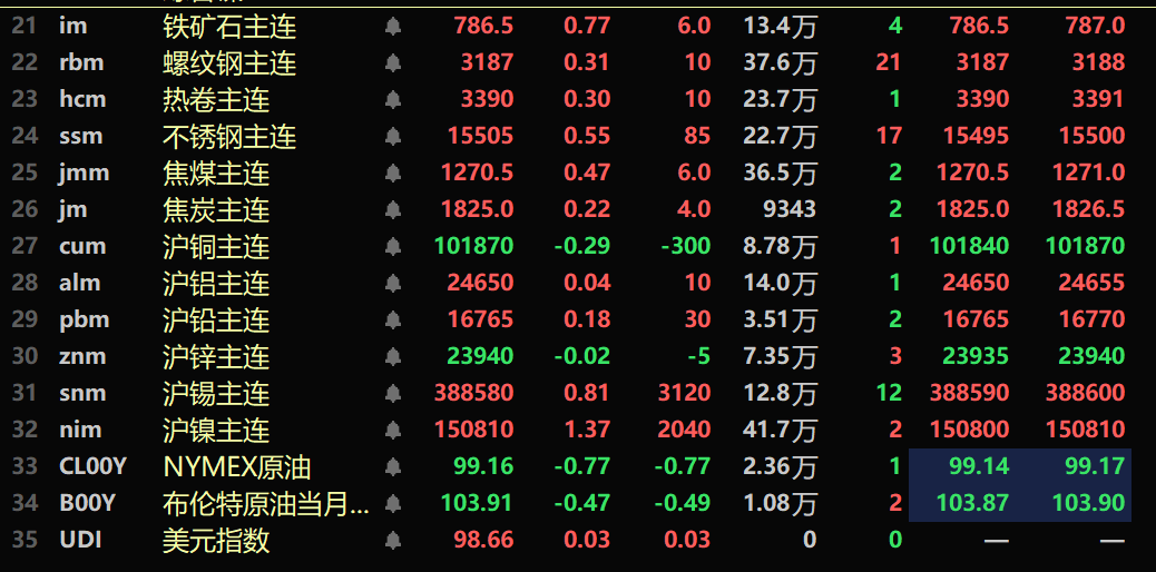 黑色系均飘红,铁矿涨0.77%,螺纹涨0.31%,热卷涨0.3%,不锈钢涨0.55%。双焦方面:焦煤主力合涨0.47%,焦炭主力合约涨0.22%。
