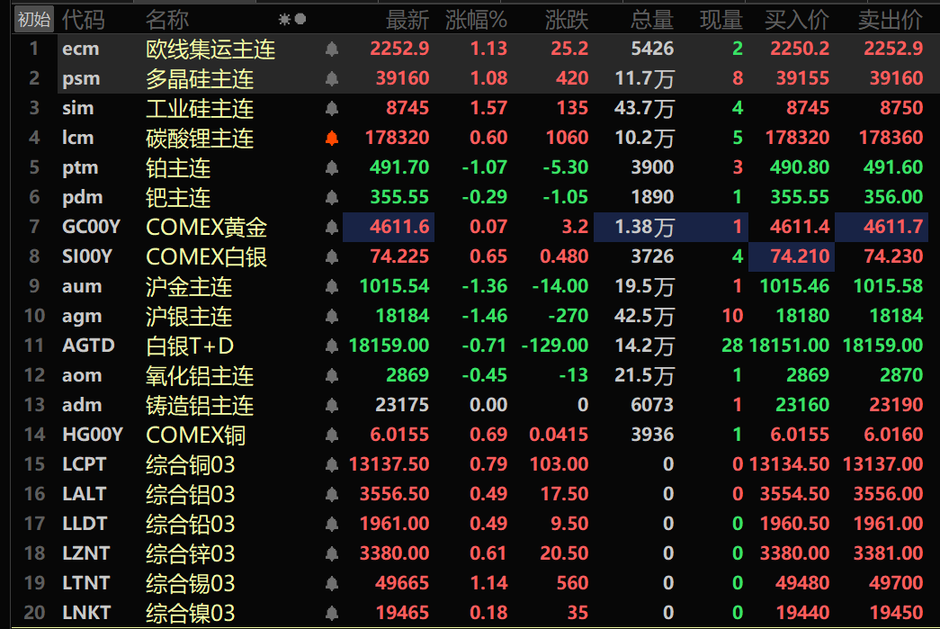 此外,铸造铝主连期货平于23175元/吨,氧化铝主连跌0.45%。碳酸锂主连涨0.6%。工业硅主连涨1.57%。多晶硅主连期货涨1.08%。
