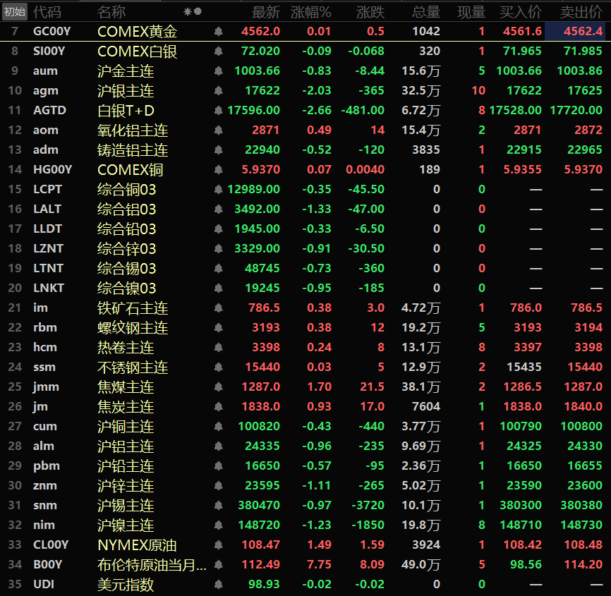 隔夜黑色系均飘红,铁矿和螺纹涨0.38%,不锈钢微涨,热卷涨0.24%。双焦方面:焦煤涨1.7%,焦炭涨0.93%。