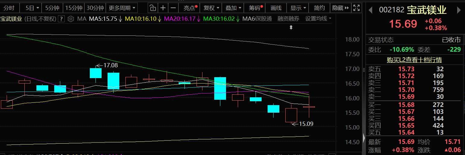 4月30日,宝武镁业的股价出现了上涨,截至30收盘,宝武镁业涨0.38%,报15.69元/股。