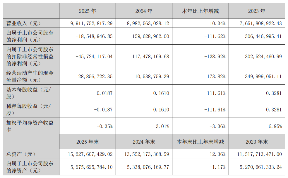 宝武镁业4月29日披露2025年年度报告显示:2025年,公司实现营业收入 9,911,752,817.29 元,与去年同期相比上升 10.34%,归属于上市公司股东的净利润18,548,946.85 元,与去年同期相比下降 111.62%。主要受镁价持续下行影响,公司镁材料业务盈利同比上年较大幅度下降;同时,公司联营公司安徽宝镁轻合金有限公司新建项目处于投产爬坡阶段,产量低、成本高,叠加镁价处于低位, 影响公司投资收益同比下降。