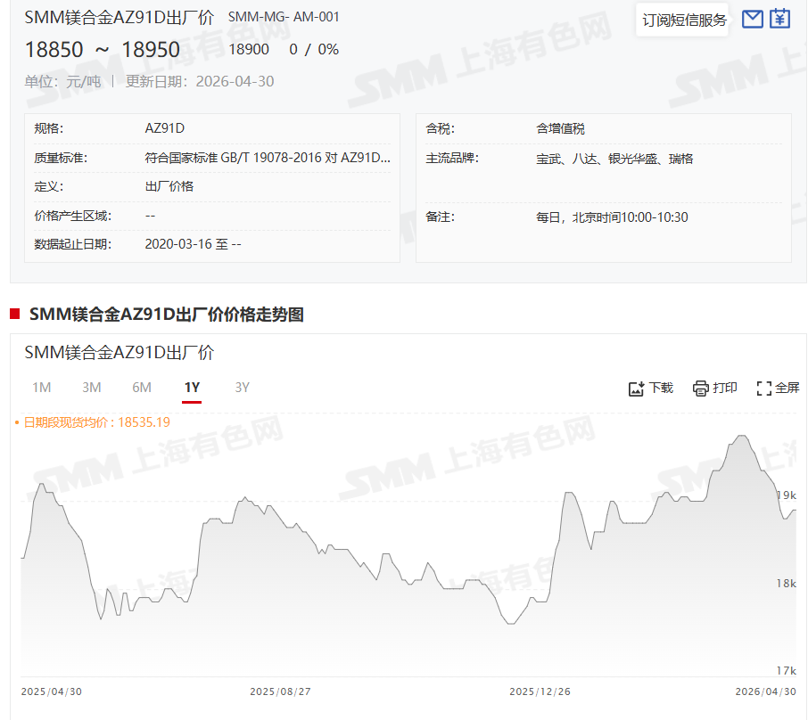 据SMM报价显示:SMM镁合金AZ91D出厂价4月30日的价格为18850~18950元/吨,其均价为18900元/吨,与前一交易日持平。